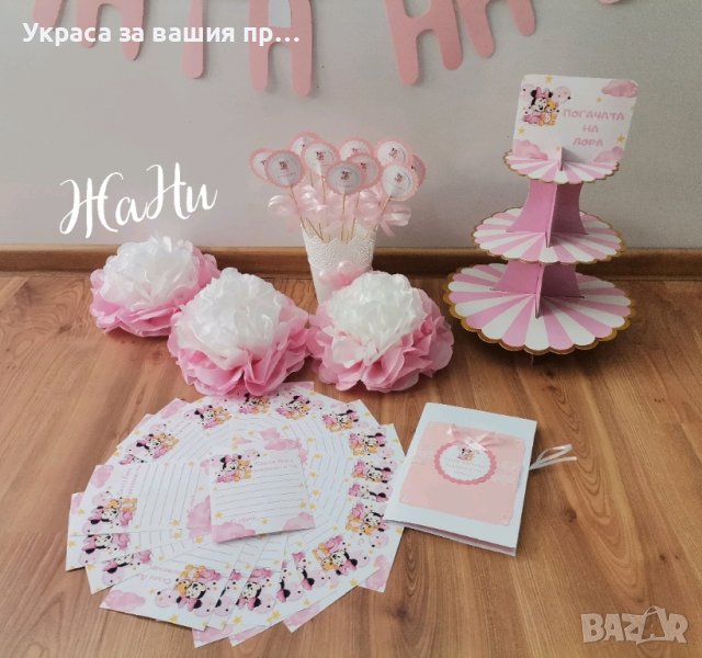 Украса За бебешка погача на тема Мини Маус*надпис*месал за разчупване на питката с името на детето и датата на празника* стойка за мъфини и сладки* цветя от тишу* карти за пожелания от орисниците в папка* топери с пожелания за орисане на бебето в кофичка