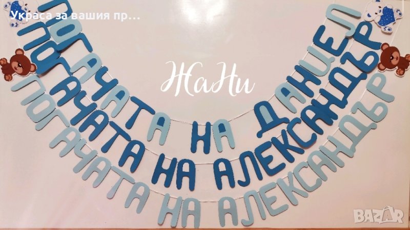 Украса За бебешка погачаВсеки клиент сам избира какви аксесоари желае да включва украсата, както и нужната бройка. * надпис* Месал за разчупване на питката с името на детето и датата (печат /текстилно фолио)* малка кърпичка за паричките с име *боди с име и дизайн съобразен с темата на празника *бонбони с дизайн съобразен с темата на празника *книга за пожелания с химикал * карти за пожеланията на орисниците, може да се поставят в папка * топки и цветя от тишу за украса * чаши * чинийки * вилички * Сламки* покривка за маса * Салфетки боди/рокля/риза/едноцветни с декорация по темата * топери с пожелания за орисане на бебе кръгли или във форма на животни, със снимка на детето или с надпис по поръчка за украса или подаръчета за гостите *Украса За маса * стойка за мъфини* топери за мъфини *табела за врата и за маса * табела бебешко шише * табела бебешка количка с надпис * Покани * подаръчета за гостите