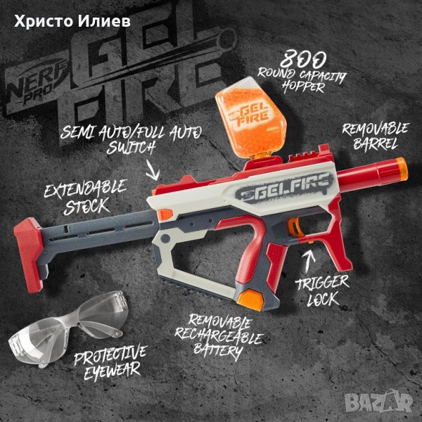 - NERF PRO GELFIRE НАПЪЛНО АВТОМАТИЧЕН MYTHIC BLASTER: има напълно автоматични и полуавтоматични режими, бункер за бърза смяна на 800 патрона с голям капацитет и сменяема акумулаторна батерия с функция за лесно плъзгане и плъзгане