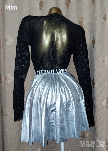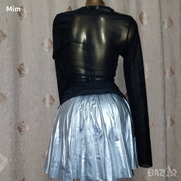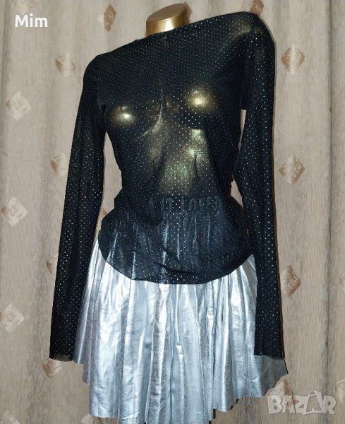 Черна прозрачна блуза с дълъг ръкав със сребристи точки и силно разкроена сребриста пола имитираща тънка кожа в талията с черен ластик с лого ,в талията 28 до 45 см едностранно, дължина 42 см .Полата е нова ,блузата е без забележки.