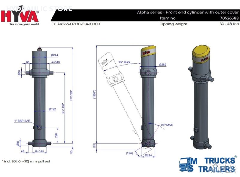 За монтирането на този Хидравличен цилиндър са необходими допълнителни елементи - горен комплект стойки и долен комплект стойки, които се заплащат отделно.