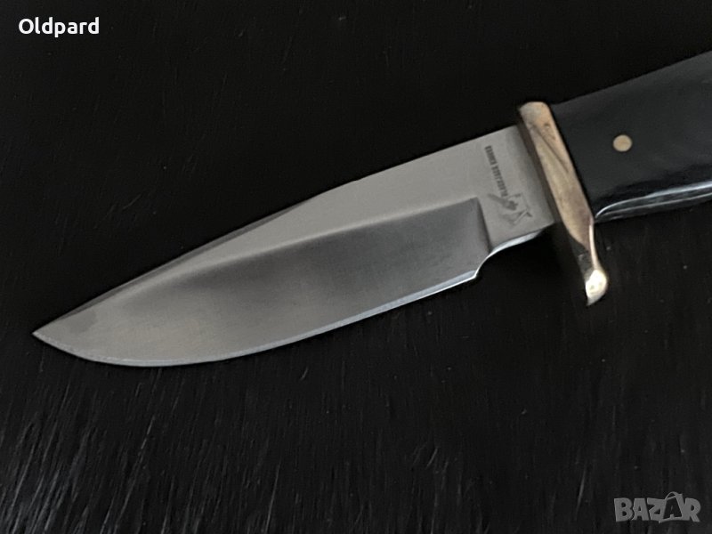 Компактен ловен нож в стила на Дивия запад. Общата дължина на ножа е 17 см. Острието е 9,0 см, изработено от неръждаема стомана 440A със сатенено покритие. Дръжка от черна микарта. Месингов гард, монтаж - Full Tang. Дупка за ремък. Черен найлонов калъф за колан. Прекрасен подарък и удобен аксесоар за ежедневието.