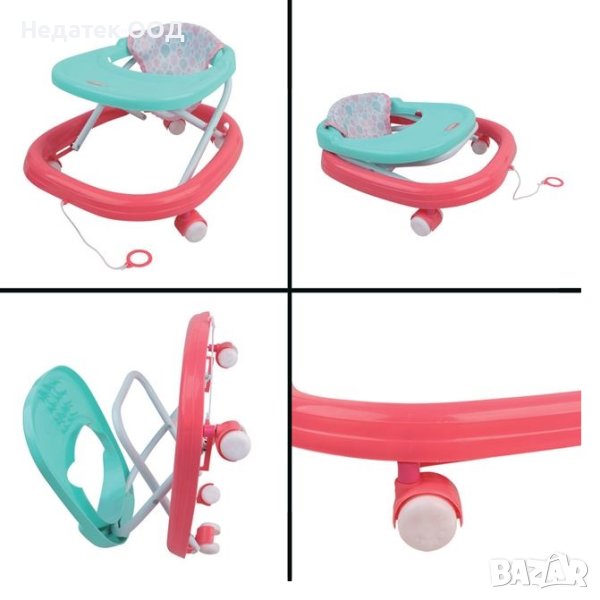 Комплект с проходилка, 35,5 см кукла с красиво облекло и шапка с 10 звука и фрази на английски език.Съдържа много аксесоари за нейната храна.Проходилката има дръжка с въженце, за да може детето да я дърпа.Работи с 3 батерии тип AG13 (включени).