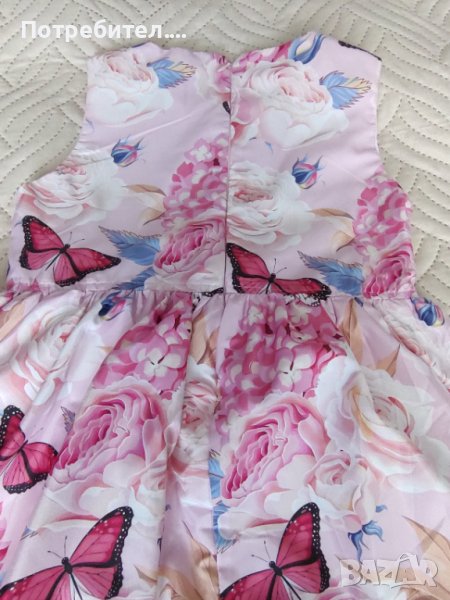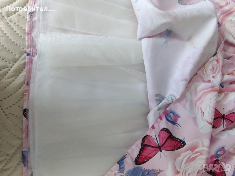 Много красива рокличка с цветя и пеперуди в розово с голяма панделка отпред. Тюлена подплата за обем. Размер 146. Отлично състояние! Не личи , че е обличана. Всъщност само веднъж. Пращам с Еконт