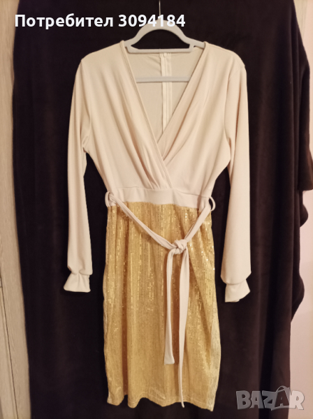 Нова официална рокля L размер , само пробвана,поръчвана по интернет,без етикет ,но ми е голяма за това я продавам !Цвят праскова към златисто, на третата снимка ,последните две снимки са реални , много стилна става за коктейл ,парти и официални събития !