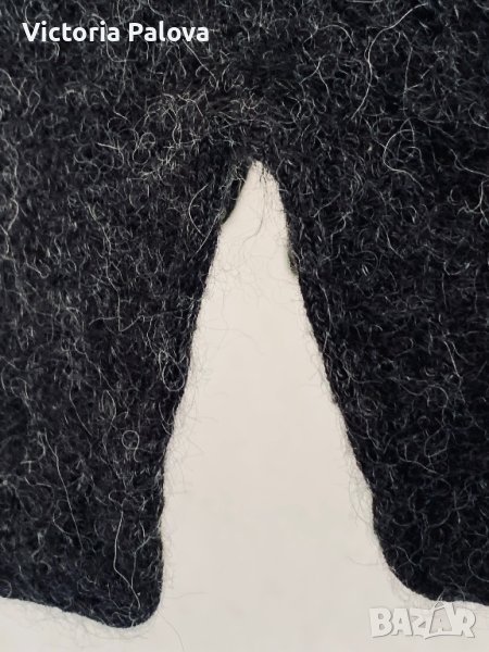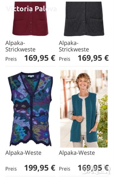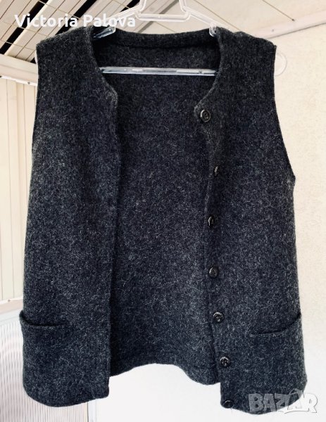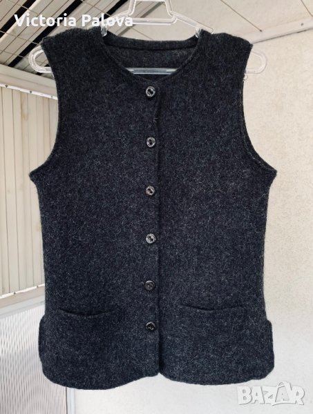 Неупотребяван елек от 100% алпака - топли 7 пъти повече от вълна, красив, модерен, мек и гладък на допир, иначе е плътен. Две външни джобчета, цепки отстрани (10см) ,закръглен долу отпред, леко се разкроява надолу във вид на камбанка, красиви гладки копчета. ГО - 48см, дължина - 65см, широчината в долния край - 53см. Елекът може да се пере в пералня.