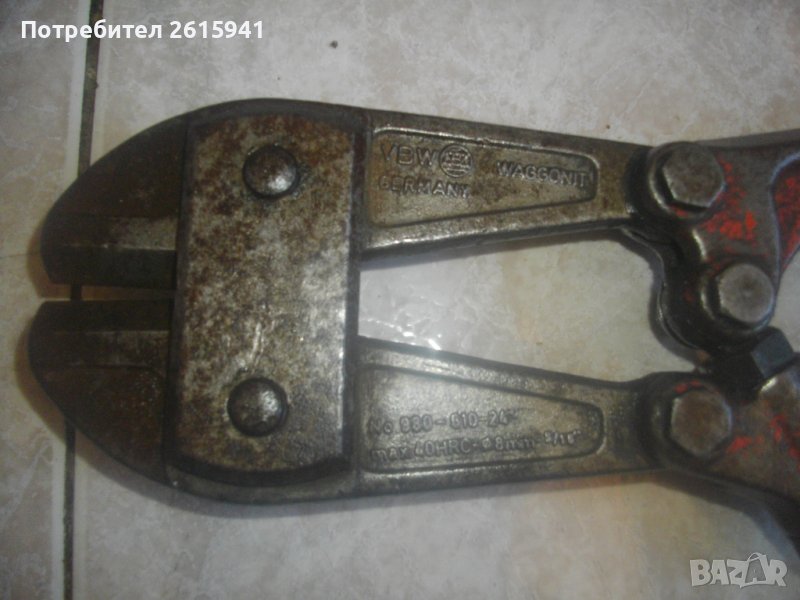 ОПИСАНИЕ на ръчна ножица рязане арматура /по-дългата / - 610 мм. Цена 149 лв. Професионална, старо качество, от стария материал. Марка, модел, маркировки - VBW WAGGON IT Germany № 980-610 - 24 инча. Max 40 HRC - ф 8мм 6/18 " -DBGM . Рязане до ф 8 мм арматура. Челюсти остриета - отлични, без никкави наранявания. Дръжки - тръби ф 25 мм. Тегло на ножицата - 3,0 кг.