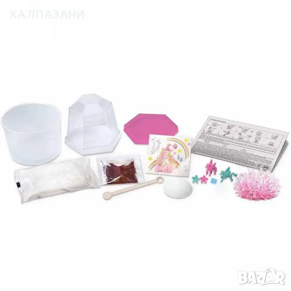 "! Той съдържа брокат, лъжичка, терариум, стикери и аксесоари. Следвай инструкциите, които ще те запознаят подробно с кристалите, които ти предстои да си отгледаш, както и любопитни факти за тях. Щом пораснат достатъчно, можеш да ги сложиш в терариума и да добавиш еднорозите и стикерите за интересен ефект. След като приключиш с интересния експеримент, постави терариума в детската си стая на видно място и се похвали на приятелите си.