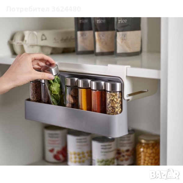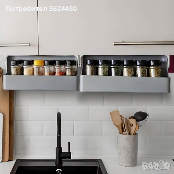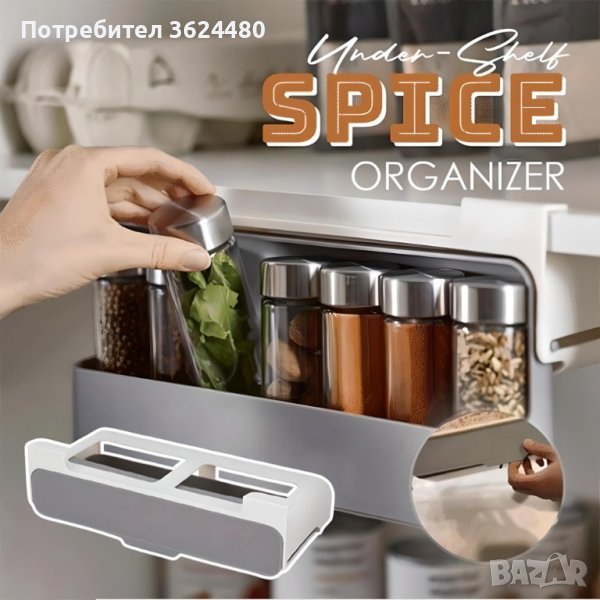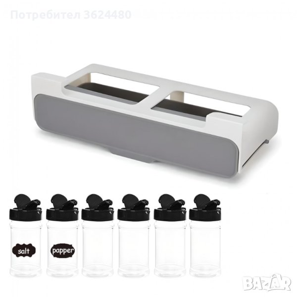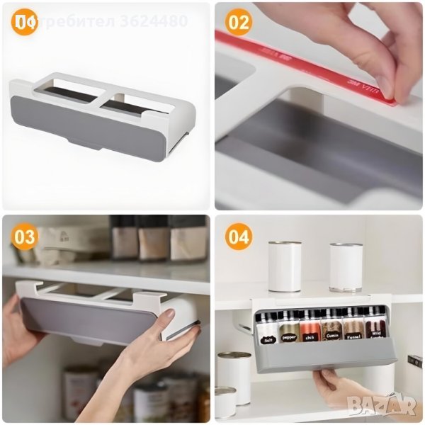 С 6 включени бурканчета, този органайзер не само осигурява удобство, но и оптимизира пространството под кухненските рафтове. Монтажът е улеснен благодарение на вградената самозалепваща се основа, като допълнително предлага възможност за съхранение на различни кухненски принадлежности.