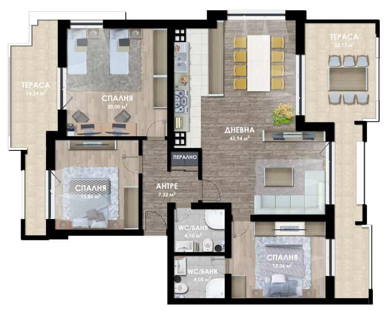 Предлагаме на вашето внимание просторен и светъл многостаен апартамент в нов жилищен комплекс в близост до Гребна База. Жилището е разположено на 4-ти (предпоследен) жилищен етаж с обща площ 183,43 м2 (ЗП: 164,83 м2 /Общи части: 18,60 м2). Апартаментът разполага с голяма дневна с кухня, 3 спални, 2 бани, голяма тераса. Жилището се намира в сграда Б на комплекса с изложение югозапад, северозапад и североизток. От терасите и големите френски прозорци се разкрива панорамна гледка към Тепетата и Стара Планина.