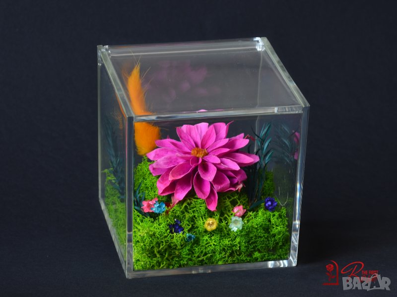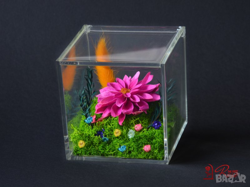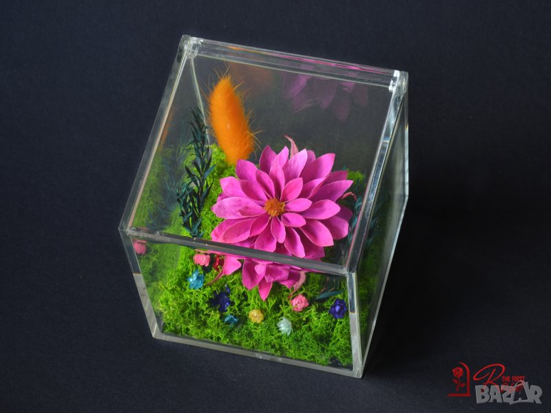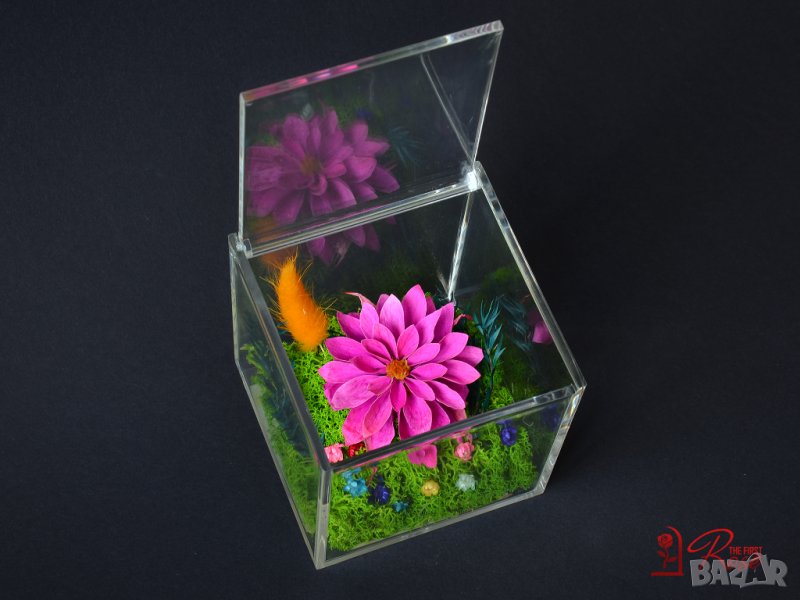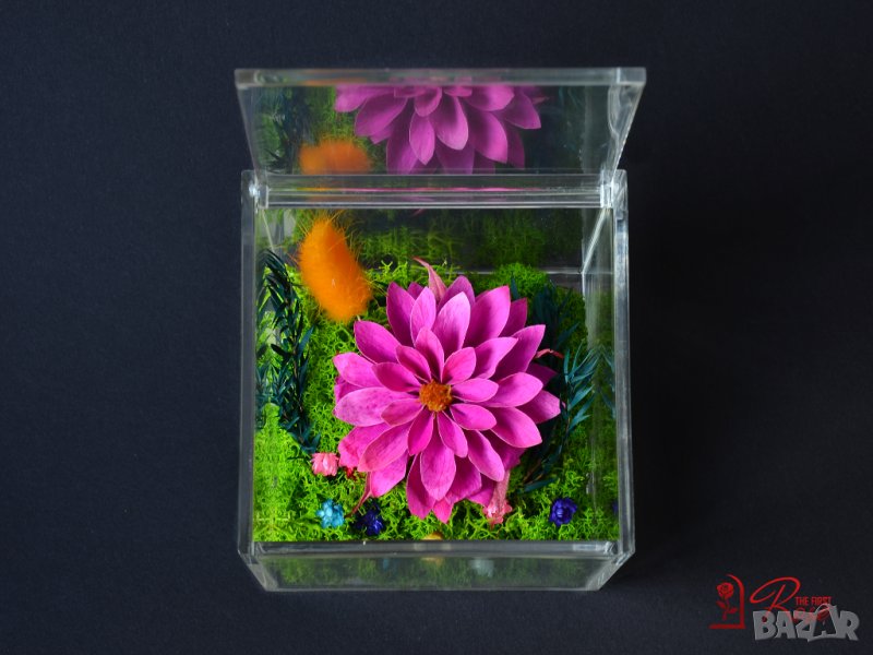 Представяме ви стилна флорална аранжировка изработена с естествена вечна далия, скандинавски мъх, нежни цветчета и дехидратирани живи растения поставени в прозрачна плексигласова кутия с капак.