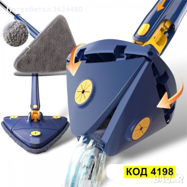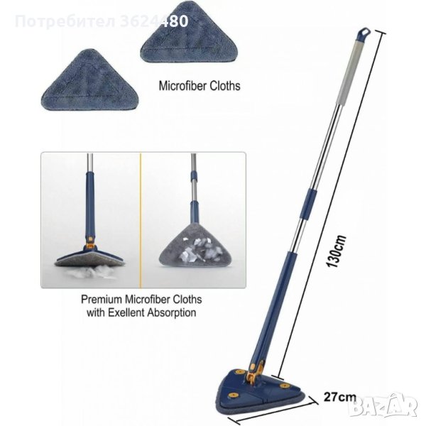 функция за автоматично изстискване, ще улесните процеса на почистване. С неговата иновативна 360° глава, този моп е идеалният помощник за дълбоко и ефективно почистване на всеки ъгъл и край вашия дом. Триъгълният дизайн му позволява да достигне до труднодостъпни места, като ъгли и ъглове, където други мопове не могат да стигнат.