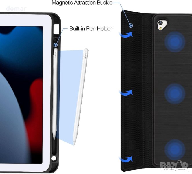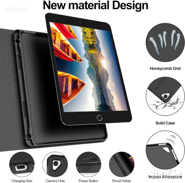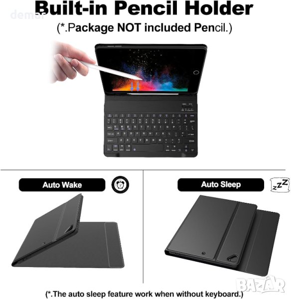 Универсалният калъф за клавиатура е пригоден за моделите iPad 10,2" и 10,5", съвместим с iPad 9-то/8-мо/7-мо поколение, iPad Air 3-то поколение и iPad Pro 10.5. Той разполага с магнитно подвижна клавиатура, позволяваща изживяване като на лаптоп с безжична Bluetooth връзка и шоколадови клавиши за гладко писане. Калъфът предлага регулируеми ъгли на видимост с три вдлъбнатини за пейзажен режим, подобрявайки гъвкавостта на вашия iPad. Той включва функция за автоматично заспиване/събуждане за енергийна ефективност и удължен живот на батерията, с над 72 часа непрекъснато работно време и 30 дни в режим на готовност при пълно зареждане. Пакетът включва калъф за клавиатура, USB-C кабел за зареждане и ръководство за потребителя,