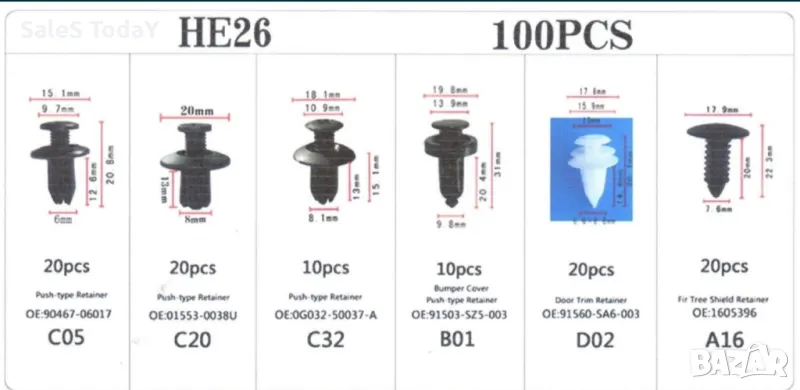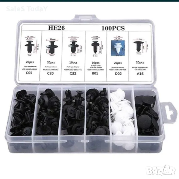 Комплект от 100 щипки за кола. Комплектът включва 6 най-популярни вида щипки, сортирани по 10 и 20 броя. Удобен, компактен калъф с отделения предотвратява смесването на елементите на комплекта. Всички камери на кутията са подписани, което улеснява намирането на точния клипс.