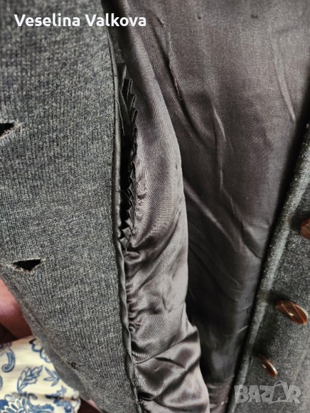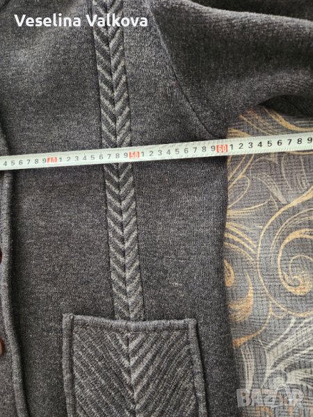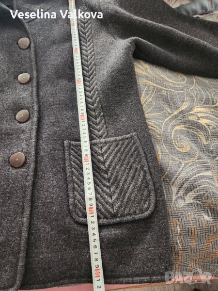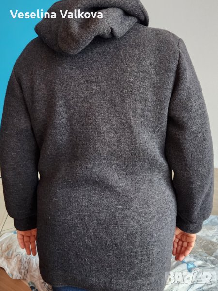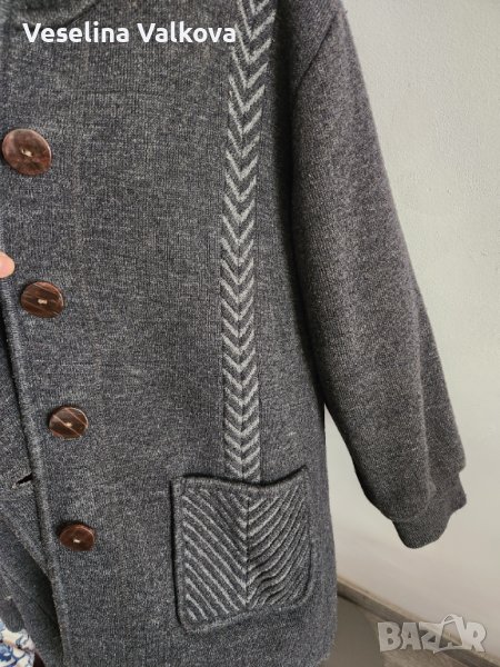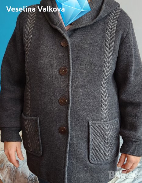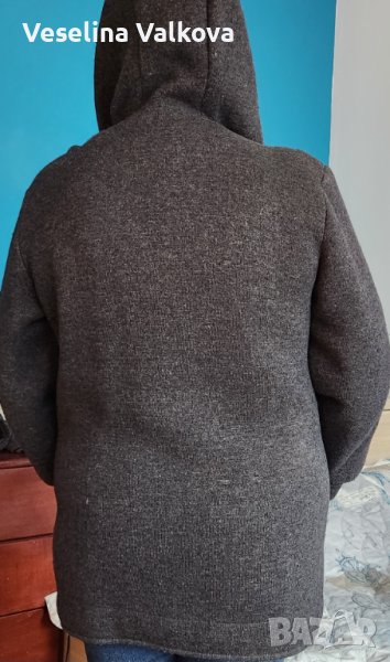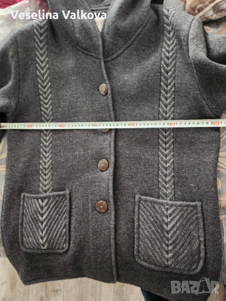 Машинно плетено по поръчка вълнено яке/жилетка в сив цвят, с качулка, вътрешен скрит джоб+ два външни. Размери: от мишница до мишница-60см., дължина на ръкава от рамото - 56 см., дължина от рамото до долен ръб- 80 см. Има и подплънки. С тънък хастар . Якето е без забележки.