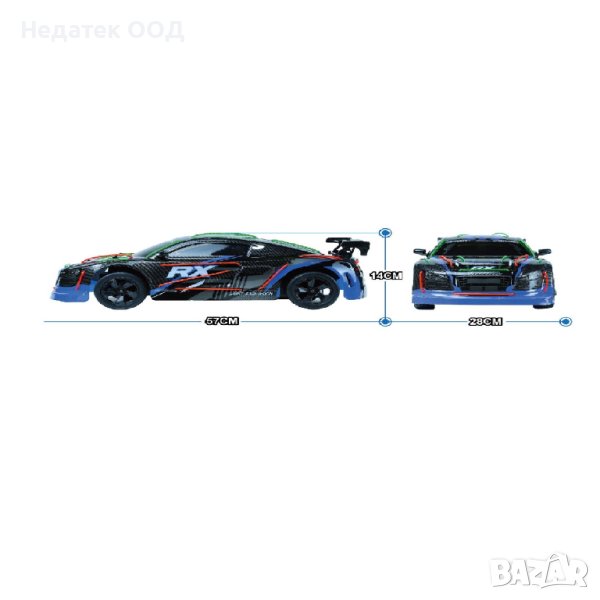 Високоскоростно 2.4G превозно средство с дистанционно управление с NEON светлинна тръба и осветление с дистанционно управление. Има пълна функционалност и оригинален стил. Включен USB кабел. Максимално време на работа 15 минути, време за зареждане 3h, максимално разстояние от контролера 25m. Работи с 1 батерия 7.4V 500mAh за автомобила (включена) и 2 батерии AA за контролера (не са включени).