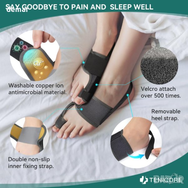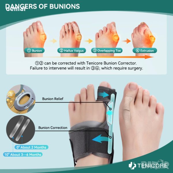 Комплектът коректор за буниони, предназначен както за жени, така и за мъже, включва подвижни пластини на пръстите на краката под ъгъл 0°, 10° и -10° за поддържане на подравняването на пръстите на краката за различни степени на тежест на буниона. Той ефективно подравнява палеца на крака и осигурява облекчаване на болката, като предотвратява накланянето на пръста към съседния. Комплектът включва масажиращи силиконови пръстени за омекотяване на палеца на крака и намаляване на натиска и триенето, предлагайки повече комфорт от еднослойните платнени коректори. Неговият двоен нехлъзгащ се дизайн и регулируемите велкро ленти осигуряват гъвкаво прилягане за повечето размери крака (UK размер 2-11), а подвижните ленти за петата позволяват лесно движение и използване по време на сън. Комплектът коректор осигурява 24-часова поддръжка, включително чифт коректори за буниони, две фиксиращи плочи 0°, две фиксиращи плочи 10° и ръководство.