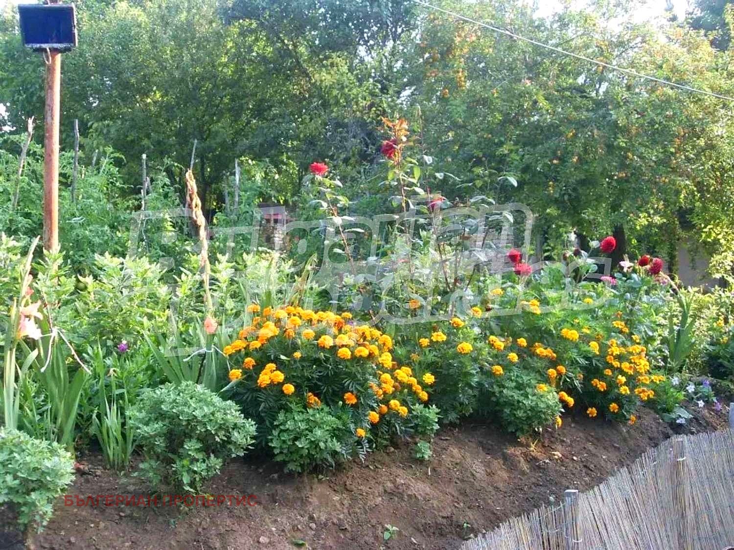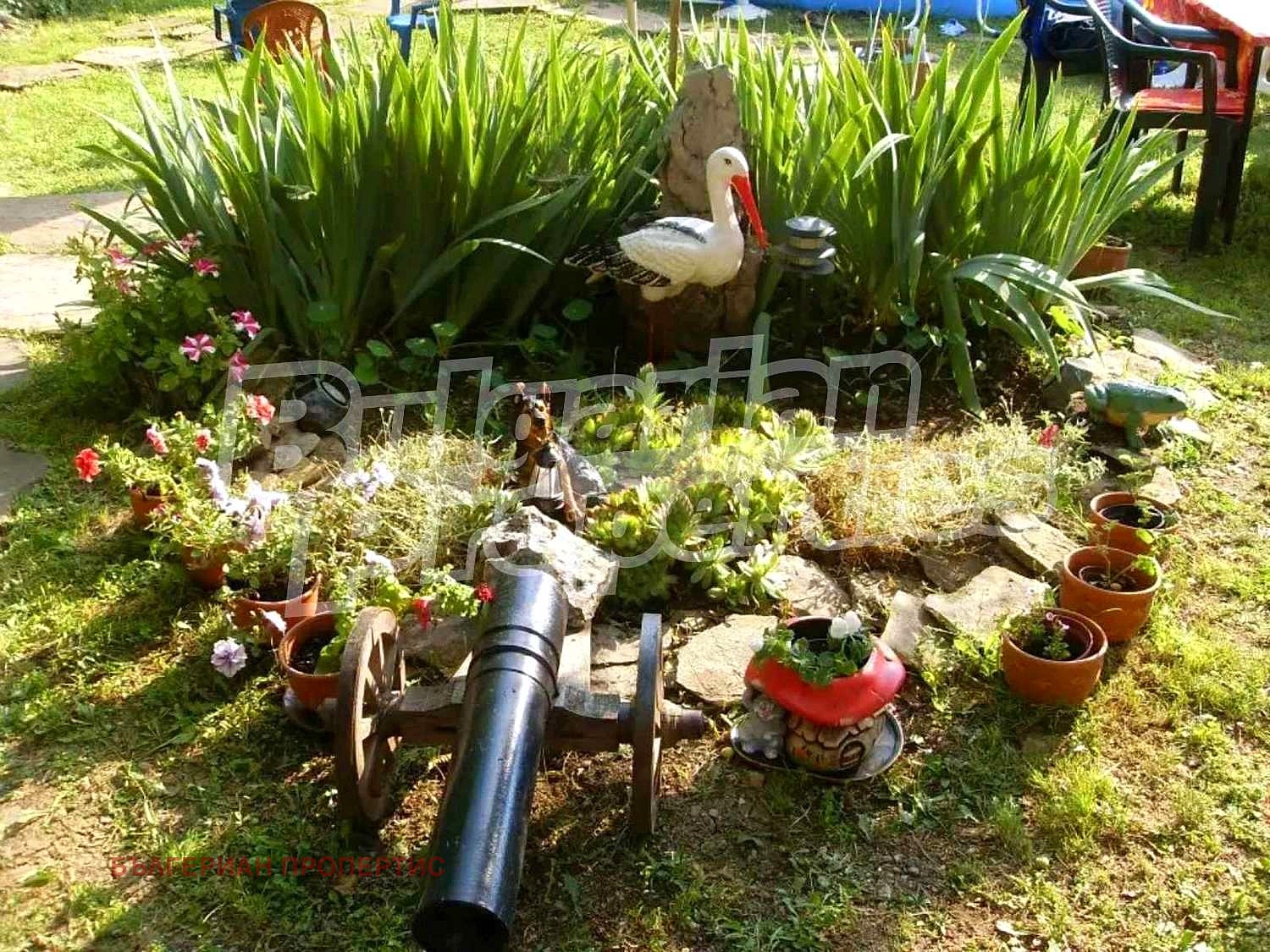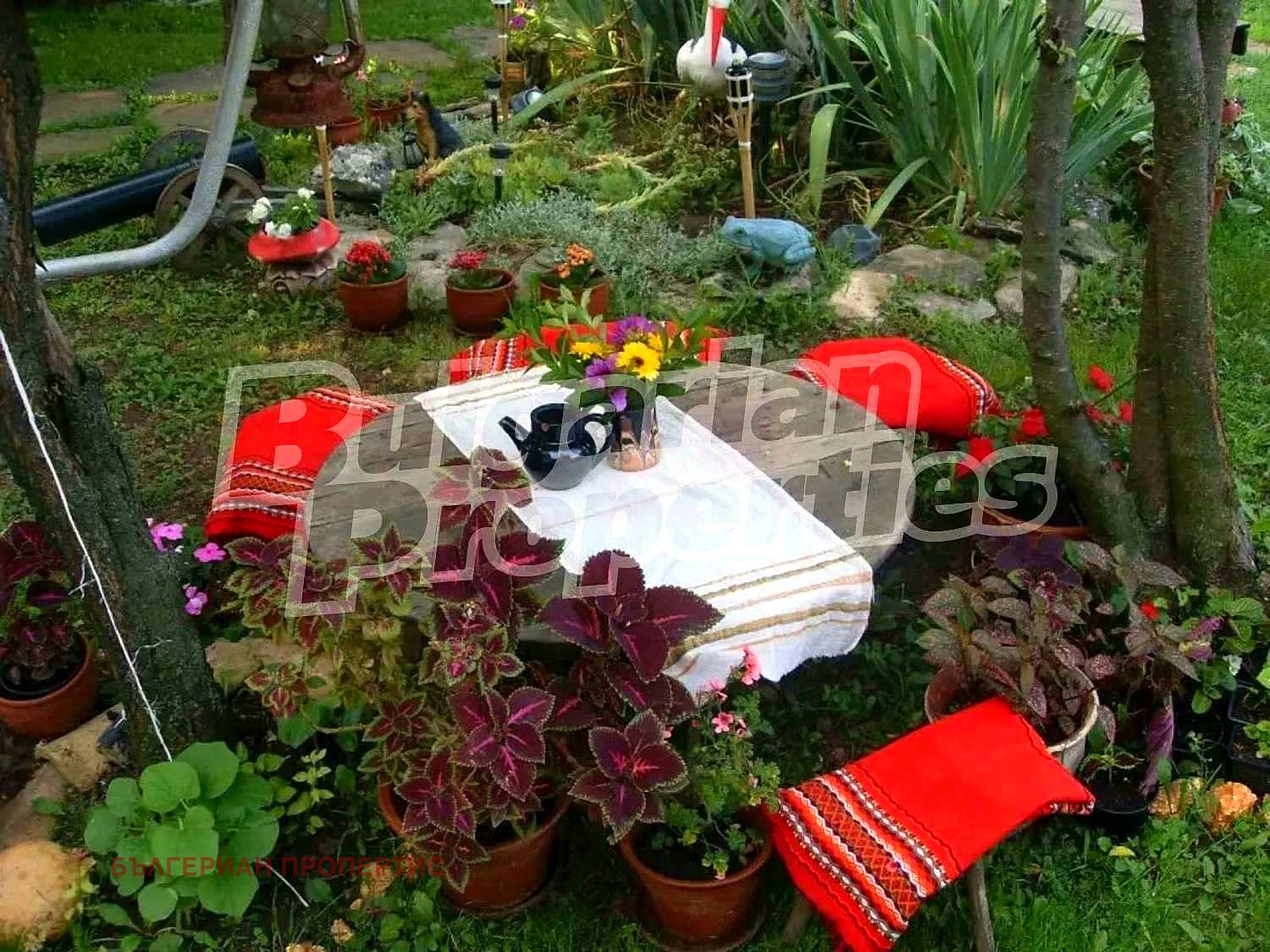 Дворът е с площ от около 1200 кв.м., с кът за барбекю, две стопански сгради, които също могат да се преустроят в жилищни.