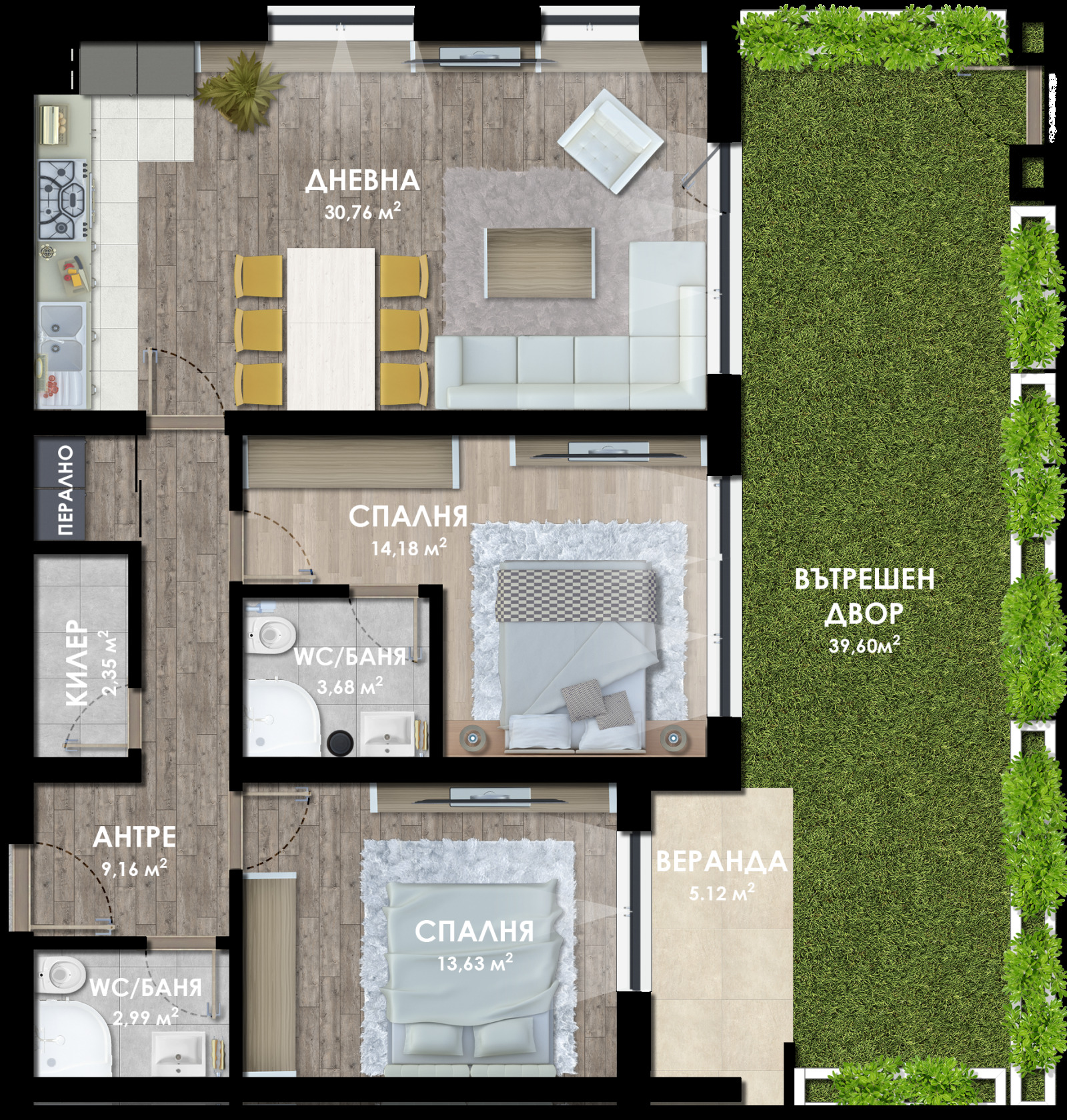 Предлагаме на вашето внимание многофункционален 3-стаен апартамент със собствен двор. Жилището е разположено на партерен етаж с обща застроена площ от 108,71 кв.м. Апартаментът разполага с просторна дневна с кухня, 2 спални, 2 бани, складово помещение и собствен двор от 39,60 кв.м. Жилището се намира в сграда В на комплекса с изложение югоизток.