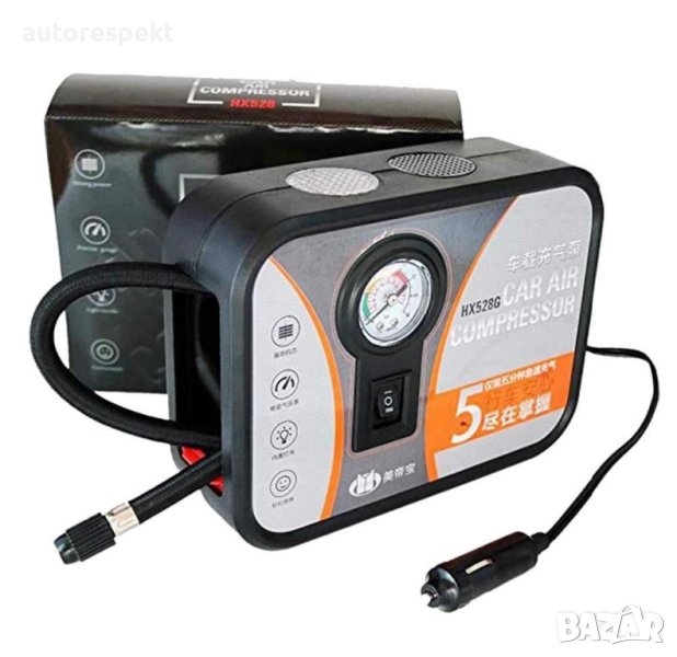 Kомпресор с лампа и манометър за помпене на автомобилни ,мото ,велосипедни гуми, въздушни матраци и надуваеми принадлежности.
