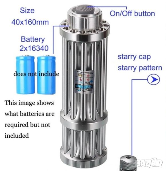 Лазера ползва 2 броя 16340 акумулаторни Li-ion батерии (не са включени в комплекта) + 9.98 лв. за брой.