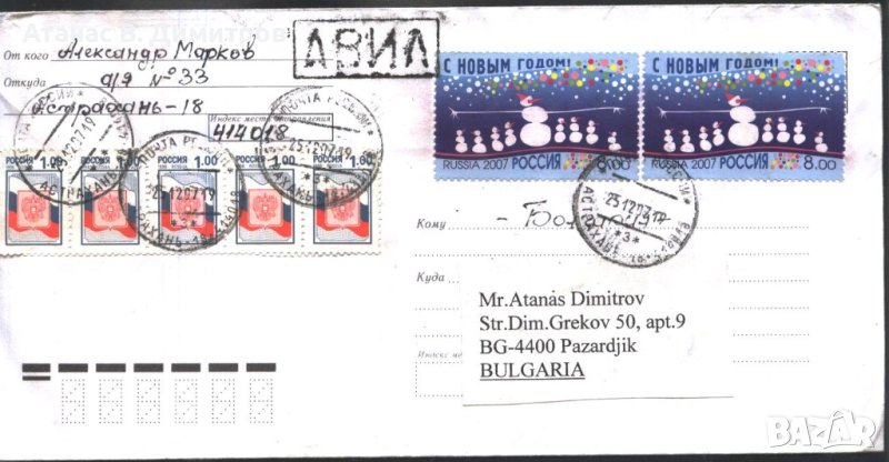 Пътувал плик с марки Нова Година 2007 от Русия.