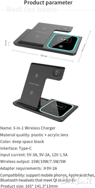 Множество устройства: Продуктът разполага с 15 W бързо безжично зареждане. 3 в 1 многофункционален, може да зарежда мобилен телефон, за Apple Airpods и iWatch едновременно. 3 в 1 безжично зарядно устройство за airpods pro 3) 2 намотки за по-голяма площ за зареждане, позволява вертикално или хоризонтално безжично зареждане. Уникален сгъваем дизайн, може да регулира ъглите към множество позиции Сертифициран по Qi/CE/FCC/RoHS,