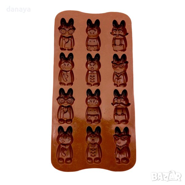 Силиконова форма за великденски сладки зайчета. Направете сами шоколадови бонбони във формата на заек. Формата съдържа 12 форми в 6 различни дизайна. Можете да използвате тази форма и за направата на кубчета лед, карамелени бонбони, дребни сладки.