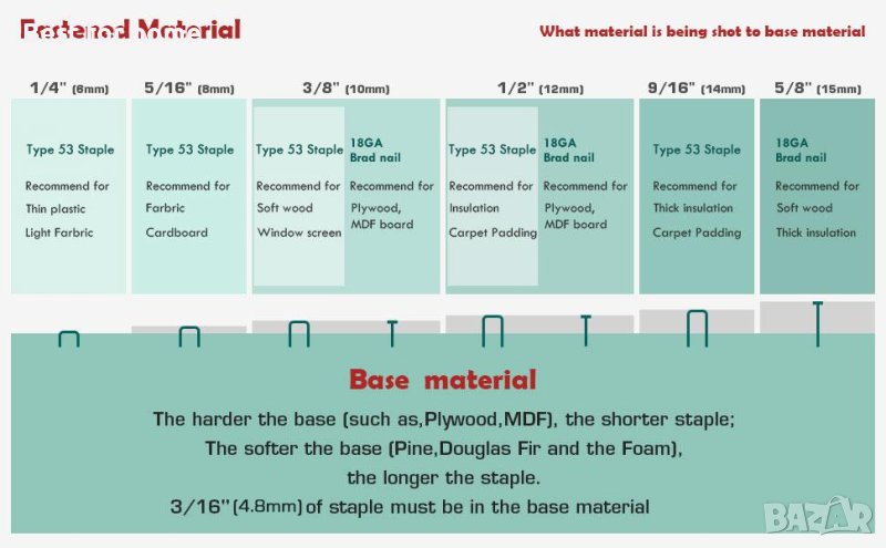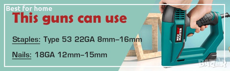 Тези пистолети могат да използват скоби: Type 53 22GA 8mm--16mm Пирони: 18GA 12mm--15mm