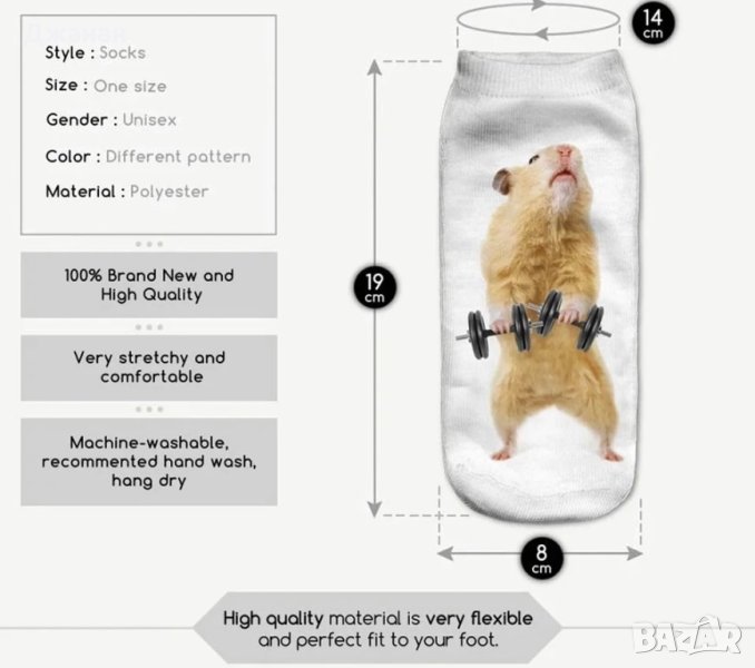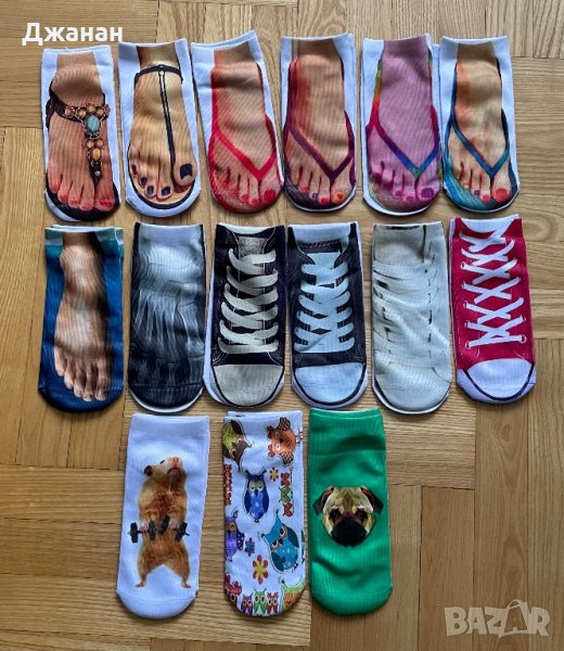 Забавни 3D чорапи с различен принт. Принтовете с ходила са с ляв и десен крак :). Номерацията е една - обхваща 33-39 номер. Цената е 4лв за чифт.