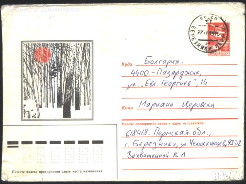 Пътувал плик Дървета Планина Зима 1986 от СССР.