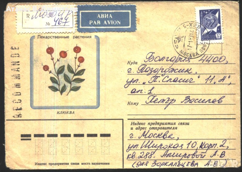 Пътувал плик Флора Червена боровинка 1973 с марка Космос 1976 от СССР.