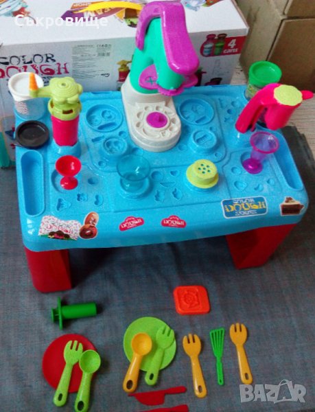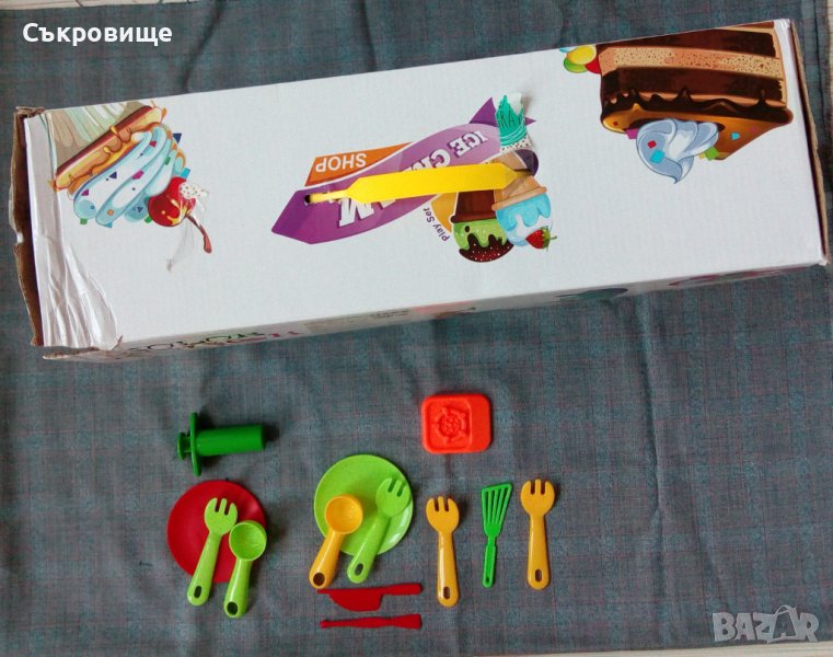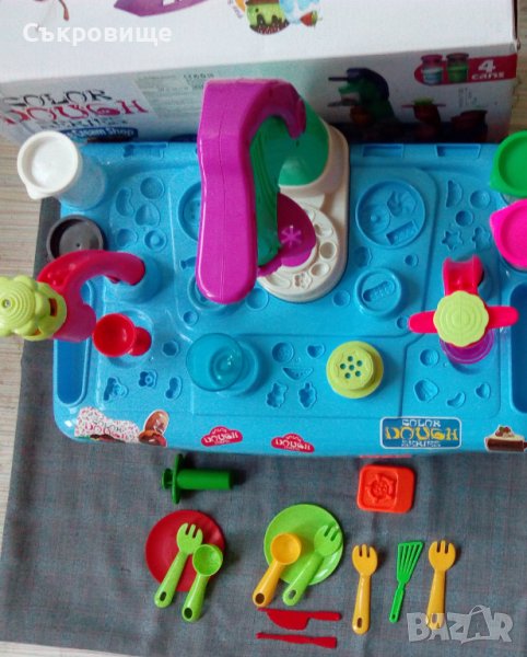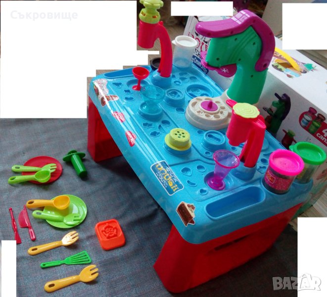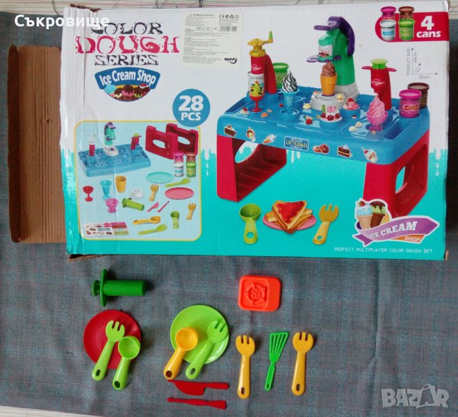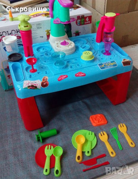 Сглобено е видно от снимките какво представлява. Липсват няколко от дреболиите - по някоя чашка или чинийка. Има шприцове, в които ес слага пластели и като се натискат все едно сладолед изтича в съдинките. Пластелинът трябва да по-пресен, за да е мек и да минава хубаво и лесно.