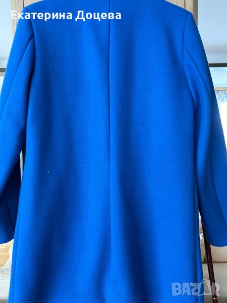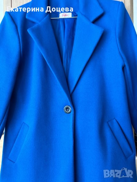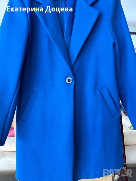 Сако в наситен син цвят, вталено, с джобове и копче. Елегантна линия. Топла материя с подплата.