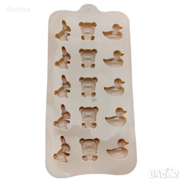 Силиконова форма за великденски бонбони зайчета, патета и мечета. Направете сами шоколадови бонбони във формата на заек, пате и мече. Формата съдържа 12 форми гнезда. Можете да използвате тази форма и за направата на кубчета лед, карамелени бонбони, дребни сладки.