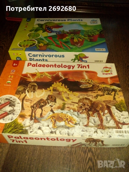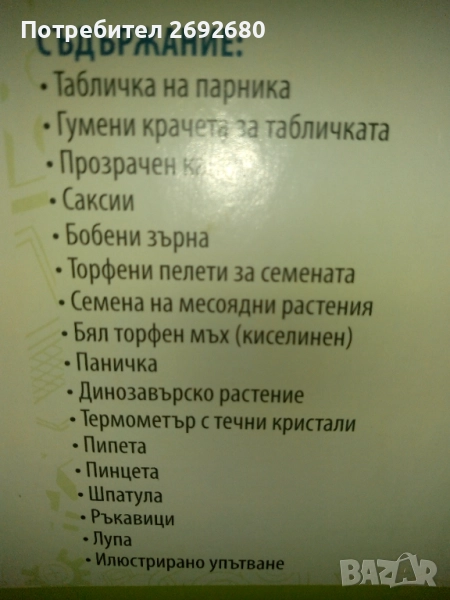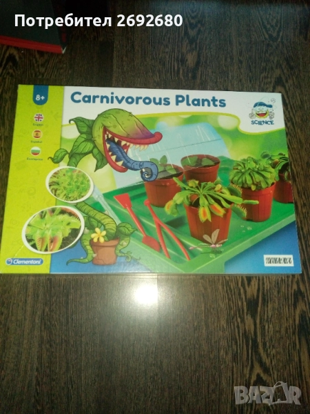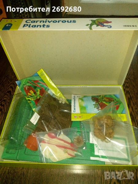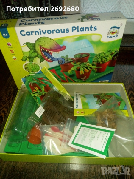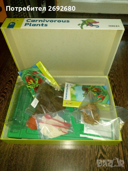 Играта "Месоядни растения" е нова, но като отвори торбичката със семената на месоядните растения, детето ги изтърва на килима и бяха толкова мънички, че не можахме да ги намерим, затова всичко от съдържанието е налично: две книжки с инструкции, бял торфен мъх, специално торфено хапче, лупа, саксии, специална дъска за отглеждане на растенията, семена на боб, ръкавици, динозавърското растение (йерихонската роза), теплица, както и всички инструменти и всичко останало каквото виждате в описанието (има снимка), само семената на месоядните растения ги няма, торбичката е празна, да не кажа, че бяха толкова микроскопично малки тези семена, че честно казано даже не съм сигурна дали изобщо имаше нещо в торбичката преди да я отвори детето...Ако на някой всичко останало от съдържанието му свърши работа за нещо, цената на тази игра е 20лв., беше закупена от Лидл за 35лв.
