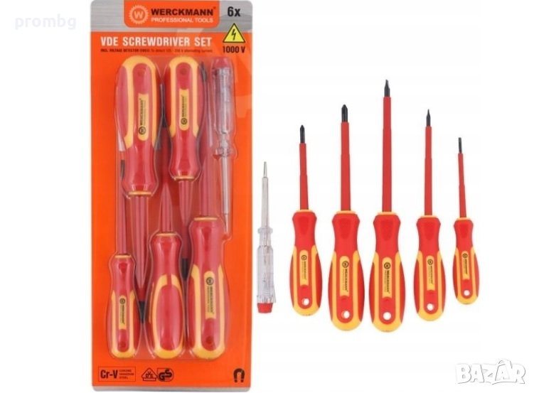 професионален комплект 5 бр. отвертки WERCKMANN и фазомер, 1000 V, внос от Германия. С магнитен връх и противоплъзгаща дръжка. VDE - стандарт. Размери на отвертките: права 3 мм х 75 мм; права 4 х 100 мм; права 5,5 мм х 125 мм; кръстата PH1 x 80 мм; PH2 x 100 мм; Материал: хром ванадиева стомана.