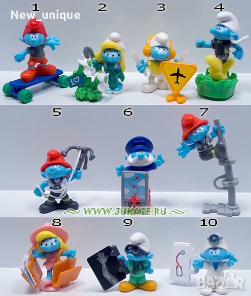 Продавам пълна колекция от шоколадовите яйца Kinder Surprise от серията "Смърфовете в града" (The Smurfs in the City) от 2018 г. Тя се състои от 10 персонажи (фигурки) смърфове с различни занимания и професии: