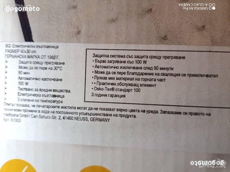 Електрическа нагревателна възглавница, наметка на раменете от немската фирма MEDISANA®, нова, бързо нагряваща = 100 W, с реле за безопасност, всички данни са на снимките, Моля вижте фото! - ВИШНЕВАТА