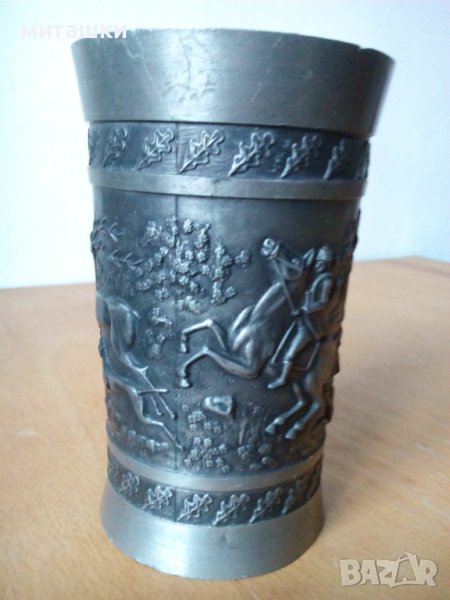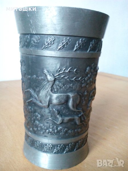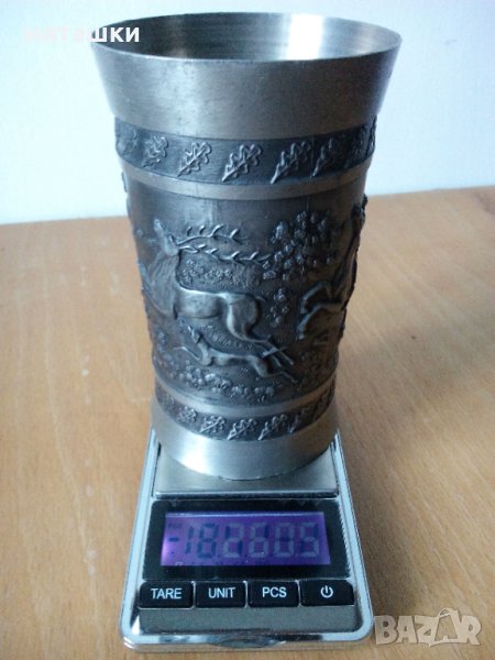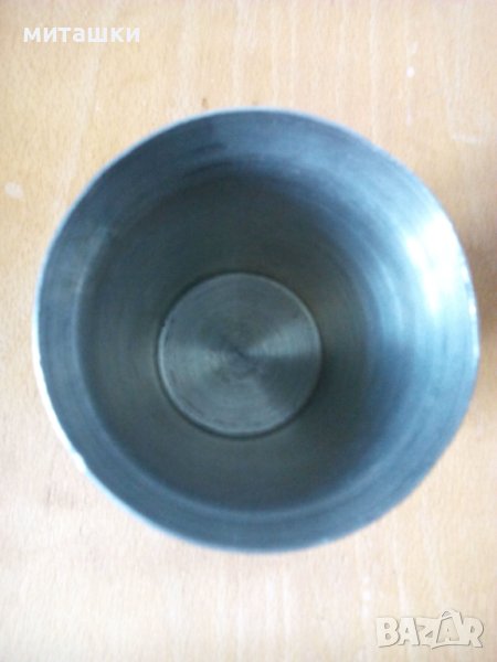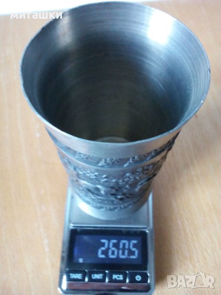 Клаена чаша 95% калай - 247 гр и 5% сребро - 13 гр , общо тегло 260 грама , височина 11,7 см , диаметър горе 7,3 см