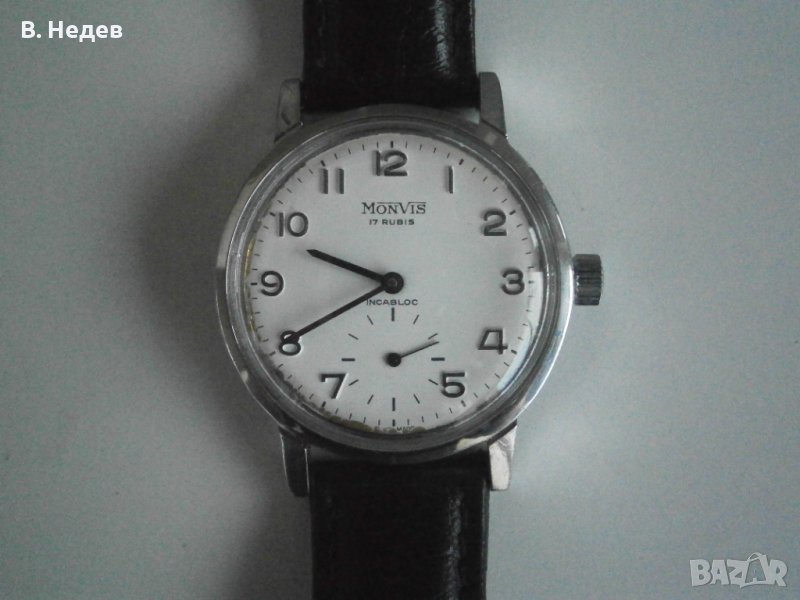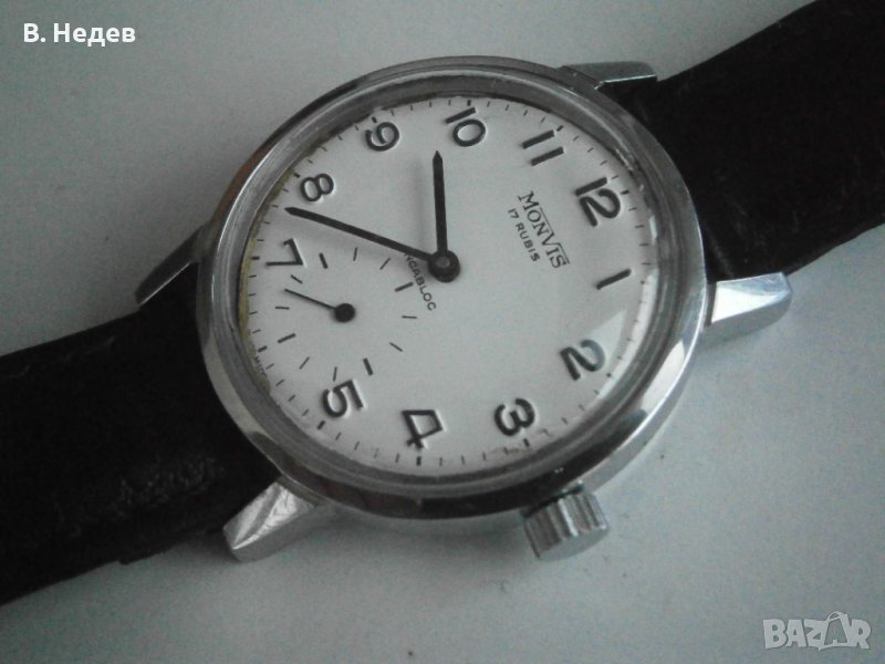Продаваме този мн. рядък VTG MONVIS, 17 rubis, swiss made, cal. UNITAS 6325, 35,5mm case - в страхотно запазено състояние 100% автентичен часовник, рядък модел с минималистичен дизайн /без компликации, като дата, напр./; готов за ползване, тъй като поддържа мн. добро време; механизъм – wehrmachtswerk, заслужава внимание! Unitas 6325, swiss made, 17 рубинови камъка, VpH 18000, резерв на хода - около 41-42 часа. В категорията Вермахтсверк /военни часовници/ попадат най-вече AS 1130, UT 6310, 6325, 6410, 6425 - великолепни механизми, които и в екстремни условия поддържат стабилна и устойчива работа и служат безпроблемно! Часовници с тези механизми са поръчвани за германската армия по време на ВСВ, както и в периода след това. Корпус - изцяло стоманен, което означава вечен, без никакви протривания, перфектно състояние. Циферблат, индекси, стрелки, машина - моля, разгледайте внимателно снимките в детайли, тъй като те са част от описанието; това, което виждате - това получавате. ЦБ - има съвсем лека патина, само в периферията /почти незабележима/, черни стрелки и цифри, великолепна четимост! Размери: диаметър на корпуса - 35,5 мм /без коронката/, височина - 11,5 мм, вкл. стъклото, ширина при лъговете -18mm; от лъг до лъг - 43мм. Ако имате някакви въпроси, моля използвайте сайта, за да изпратите запитване. Класически „dress”, военен часовник, последна профилактика преди седмица. Гарантирам за перфектната работа на механизма! Благодаря за отделеното време.., за това че разгледахте обявата! За цената - моля да имате предвид, че е крайна!