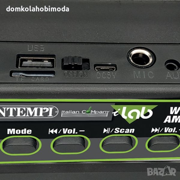 Безжичен усилвател с микрофон, радио функция и ефекти със светлини. Съдържа USB кабел, акумулаторна батерия, слот за USB флашка, както и TF карта до 32GB. Можете също така да свържете външен аудио източник (MP3 плейър, мобилен телефон и др.)
