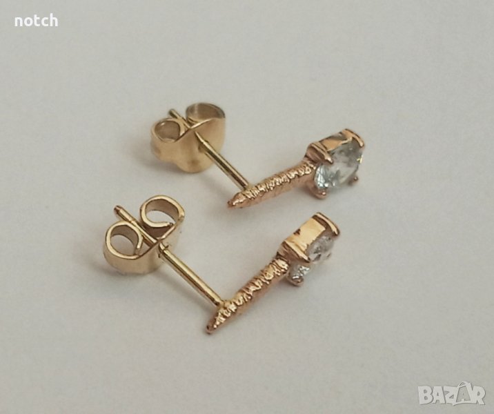Обеците са изработени от жълто злато 14 карата. Дължината им е 1см. Камъните са циркони 4мм. Могат да са направят и с друг вид камъни, както и от бяло злато.