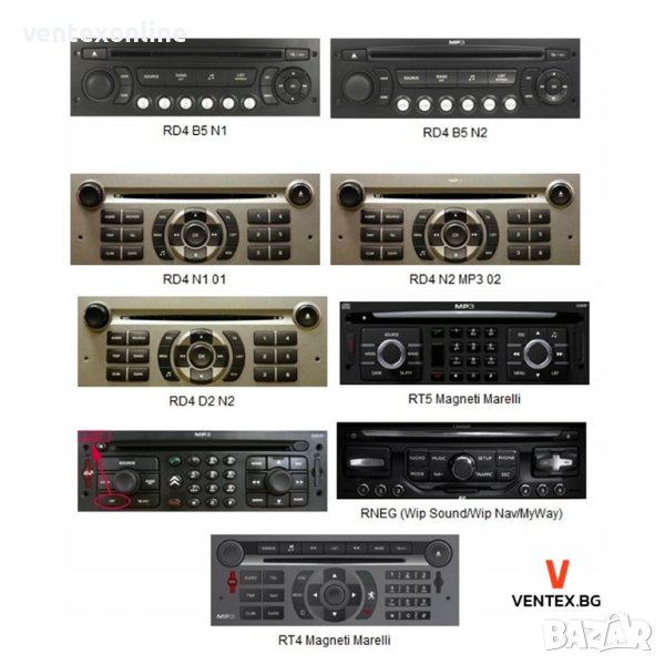 Bosch/Blaupunkt radia RD4, Bosch/Blaupunkt/VDO/Magneti Marelli RT3 (software 6.xx), Magneti Marelli radia RT4, Magneti Marelli radia RT5 без навигации с HDD, RNEG Wip Sound/Wip Nav/MyWay с Bluetooth, RT6 WIP Nav+ с изключение на системата JBL, WIP Com 3D (NG4).