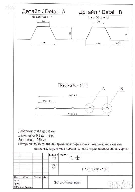 лева за линеен метър с ДДС и се отнася само за налични листа с профил TR20x270-1080 от гланцови цветове на пластифицирана