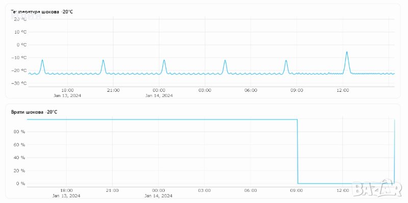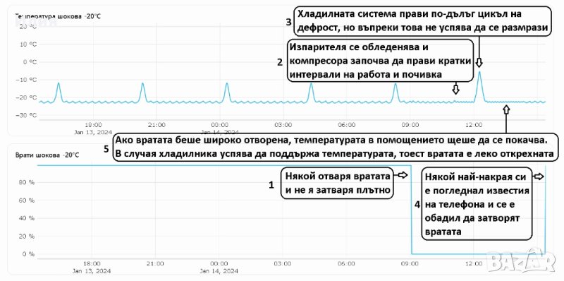 започва да прави кратки цикли на работа и почивка. В същото време течен фреон започва да го залива, което е най-опасния проблем за един компресор. От друга страна прекалено честия дефрост може значително да повиши сметката Ви за ток. Графиките, които Ви предоставя платформата Ви показват как работи вашата хладилна система. Лесно сравнявате как е работила миналата година, как работи сега, след някакъв ремонт или преустройство, как се държи през различните сезони и при различните продукти, които се съхраняват вътре.