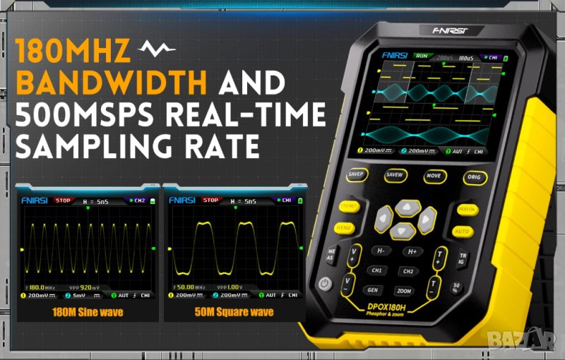 Двуканален дигитален осцилоскоп с 180MHz ширина на аналоговата лента с 500MS/s честота на пробата.