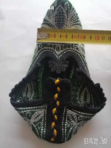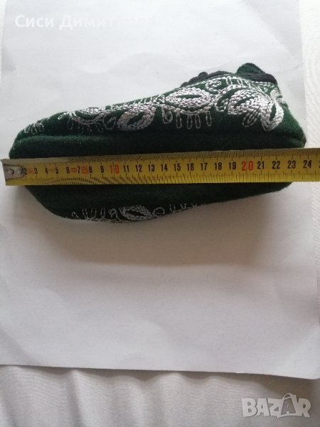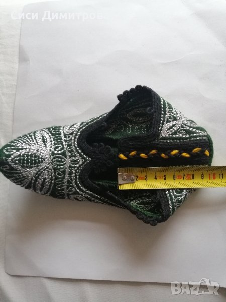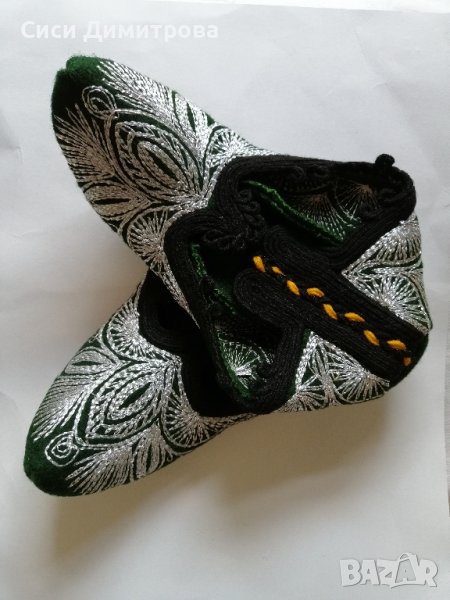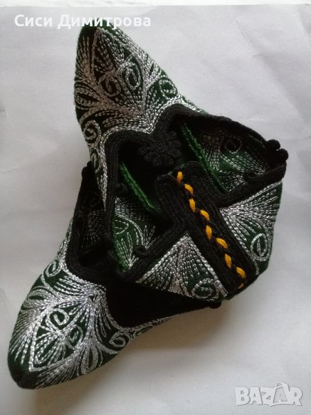 Везани терлици, вълнени, цвят: тъмнозелени, с черен гайтан и бродерия с флорални мотиви със сърма, тип: родопски, невестински чеиз, вид: фолклор и етника, хоро, ръченица, народна носия. Дължина на ходилото - 24 см (размер 37/38). Терлиците са нови, неизползвани, наследство, съхранявано в скрина на баба.