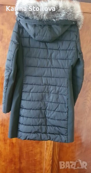 Дамско дълго зимно яке. черно на цвят. Размер С. С качулка и естествен пух, пуха се маха при пране. Няма забележки.