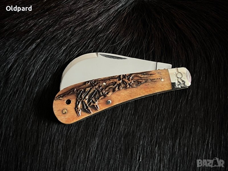 Колекционерски джобен сгъваем нож. Дължина в сгънато състояние - 10,16 см. Острие от неръждаема стомана "Ястребов клюн" с огледално покритие с дължина 8,0 см. Кафява издълбана костна дръжка с релефно изображение. Мелхиорни наслагвания. Дупка за ремък. Кутия за подарък.